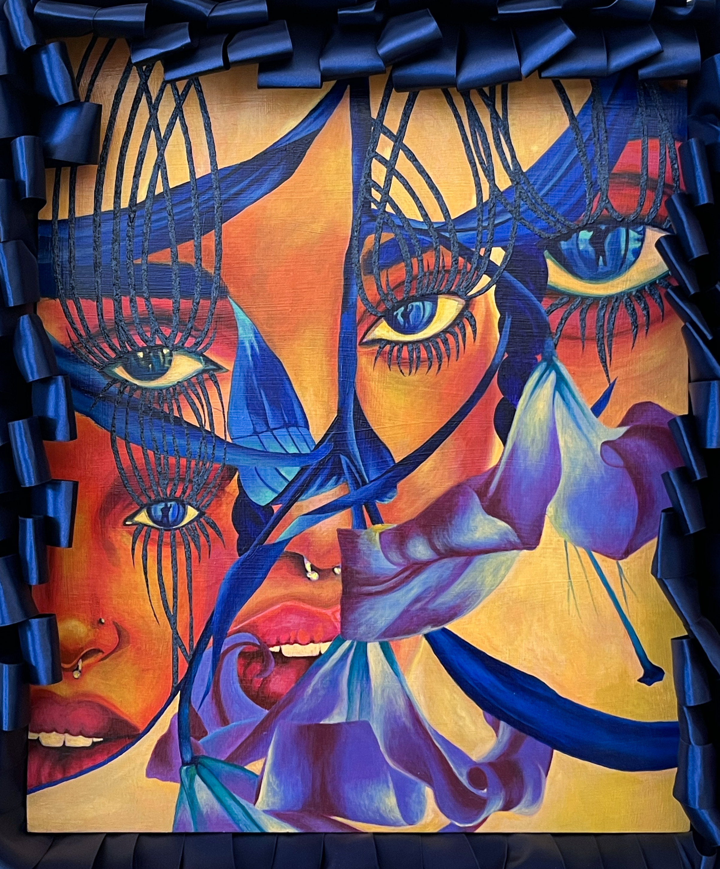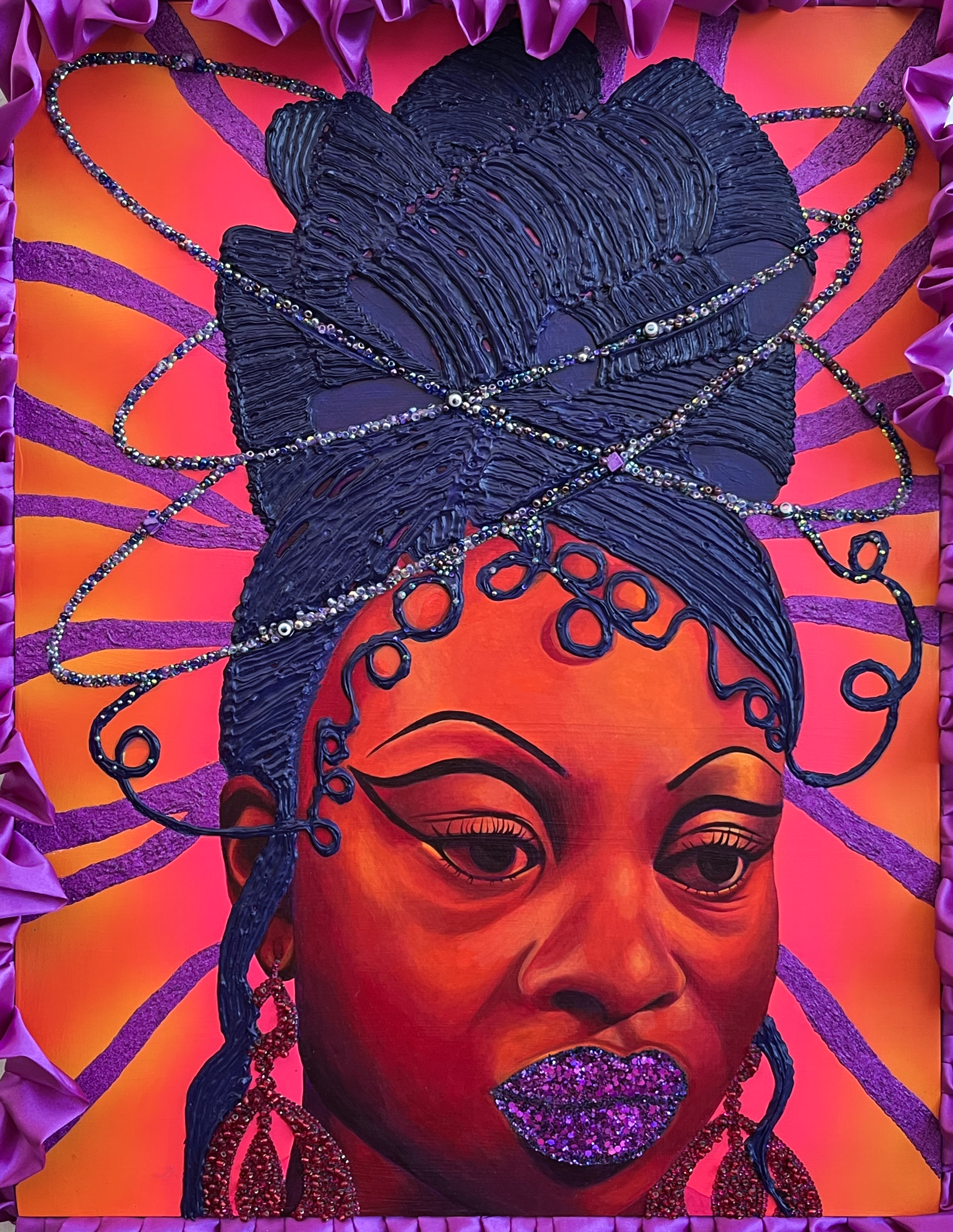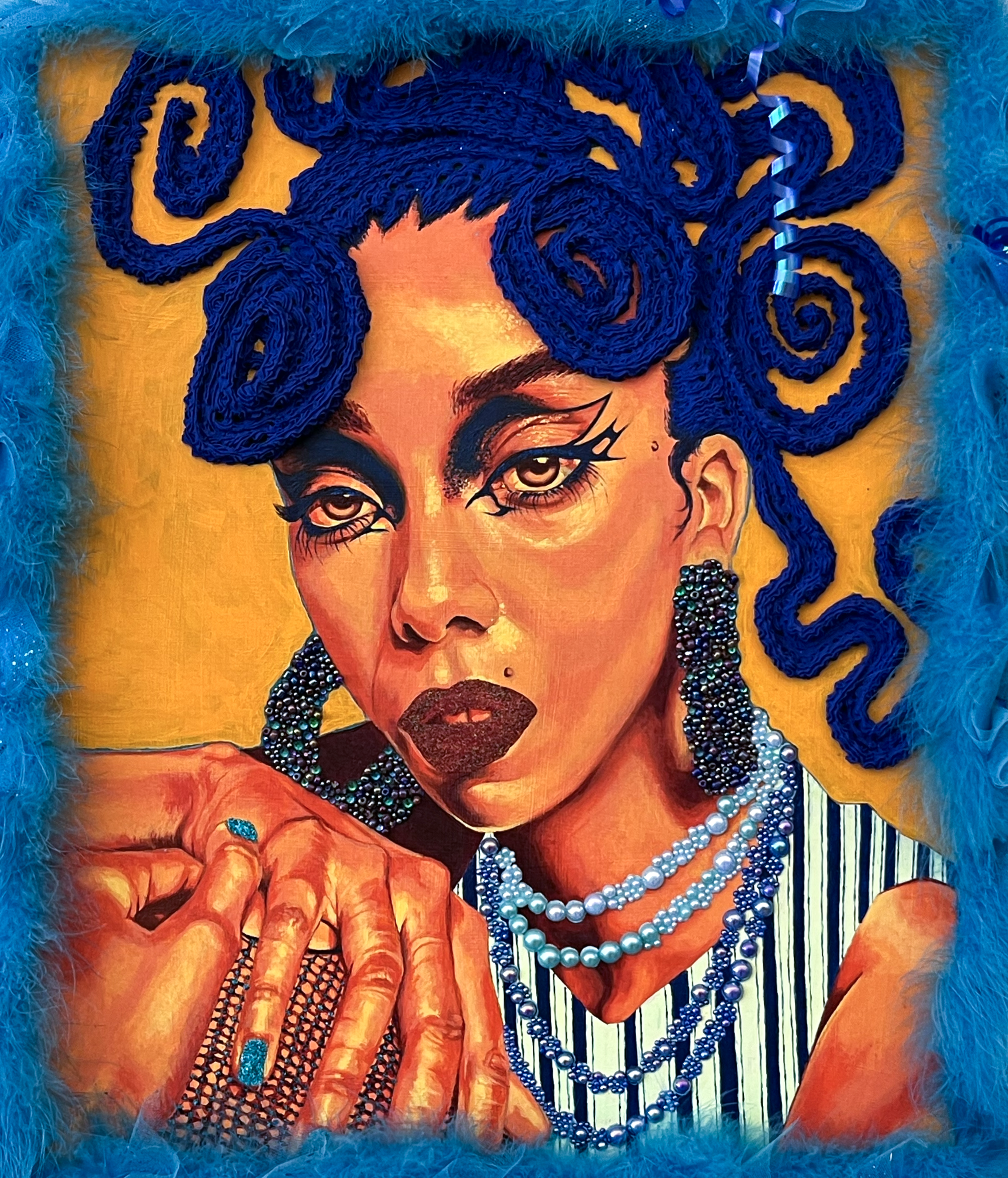 Crystal Miller is an interdisciplinary mixed-media artist currently living and working in Cleveland, Ohio. Crystal has an Associate in Graphic Design, and a BFA in Painting and SEM (Sculpture and Expanded Media) at the Cleveland Institute of Art, 2023. Her paintings and sculptures explore Afro-futurism using unconventional materials including beads, glitter, rhinestones, and foam. Recent exhibitions include “DRMWRLD” at Maria Neil Art Project in Cleveland, OH, and “Black Spaces: Defying Social Constructs” at Summit Art Space in Akron, OH.